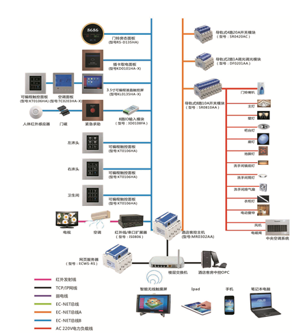 基本功能:照明開關、電動窗簾開合、插座控制、空調本地控制、空調聯網控制、背景音樂控制、模式控制、房態(tài)監(jiān)視。